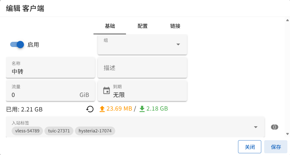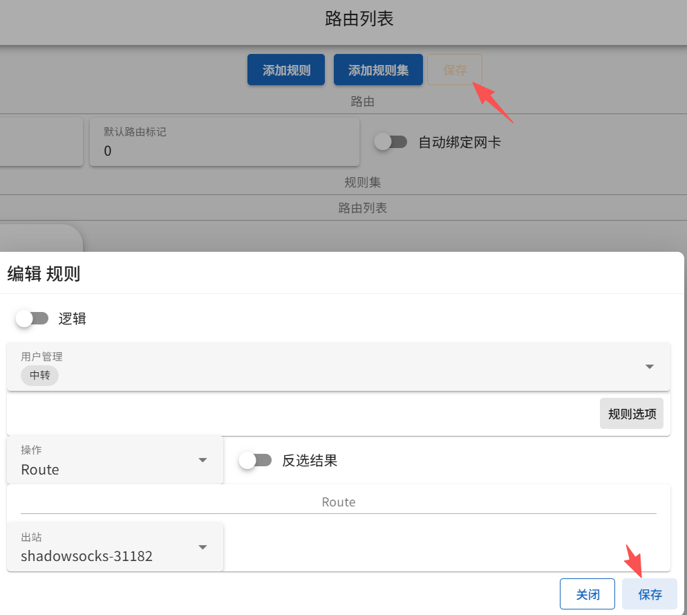 • 中转机的路由列表也得添加,保存新添加的路由,然后点上面的保存才能生效